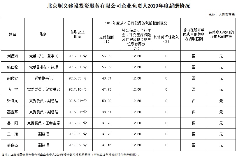 北京順義建設(shè)投資服務(wù)有限公司企業(yè)負(fù)責(zé)人2020年度薪酬信息披露