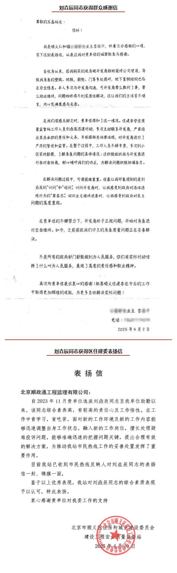 近日,順義建投下屬順政通收到了區(qū)住房和城鄉(xiāng)建設委員會建設工程安全質(zhì)量監(jiān)督站發(fā)來的表揚信,對順政通公司員工劉垚辰同志在駐勤工作中給予了充分的肯定與認可。