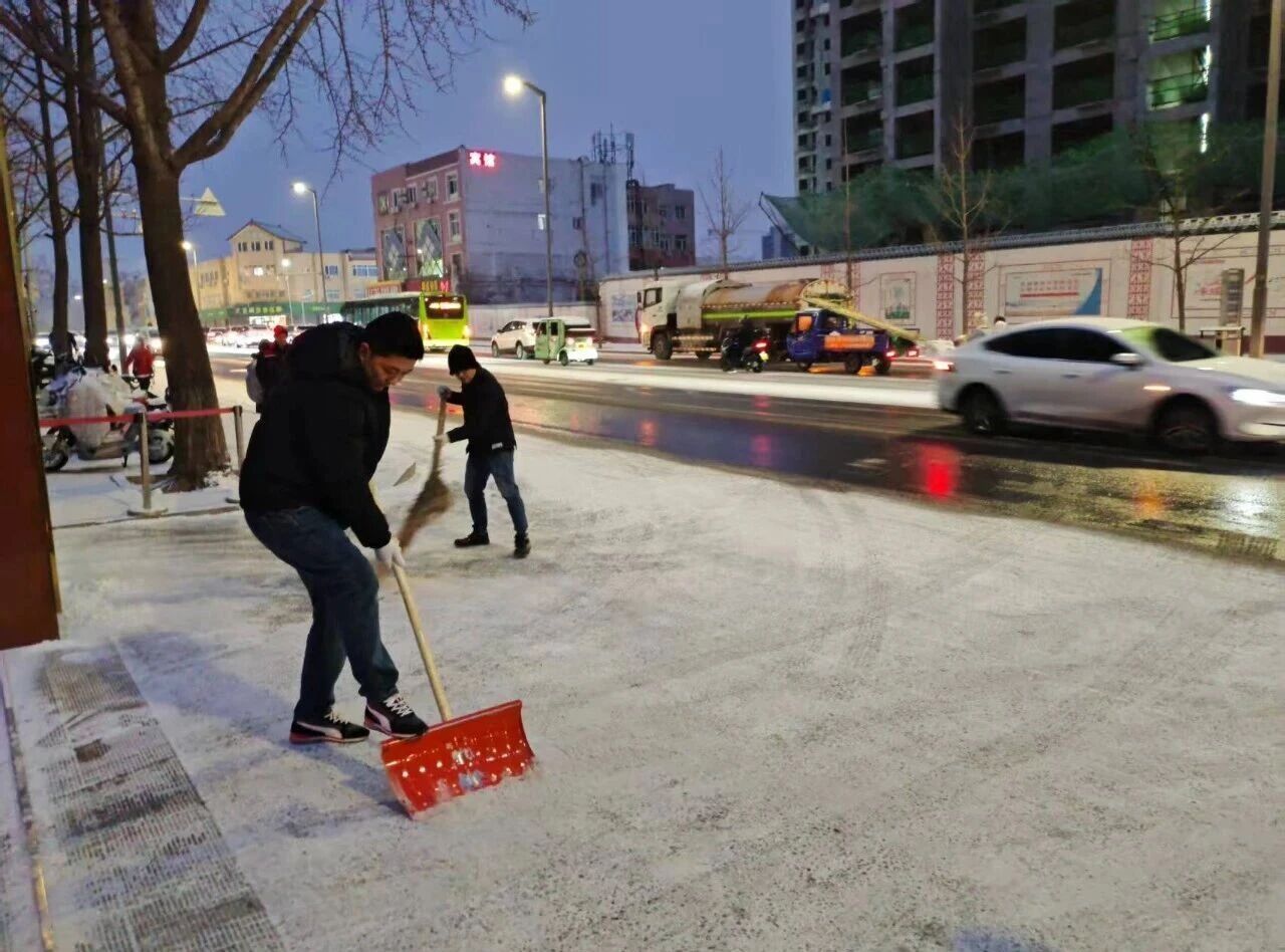 公司提前對各類應(yīng)急物資進行清點與補充,備齊除雪鏟、鐵鍬、掃帚等工具,確?!袄贸觥⒂玫蒙稀?。公司掃雪小組奔赴通順路(復(fù)興東街—濱河北路)責任路段,將掃雪范圍向公共區(qū)域延伸,實行“隨下隨掃”,在降雪期間確保一條寬度不少于1米的行人通道,完成責任道路清掃后,掃雪小組繼續(xù)清掃自身區(qū)域和門前三包區(qū)域。經(jīng)過數(shù)小時的"浴'雪'奮戰(zhàn)",積雪清理完畢,實現(xiàn)了“雪停路凈”的目標,以實際行動踐行國企擔當。