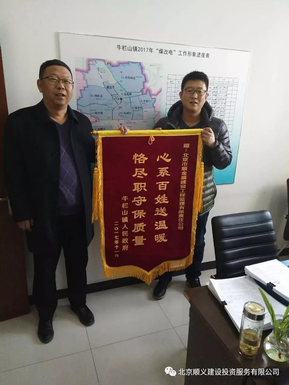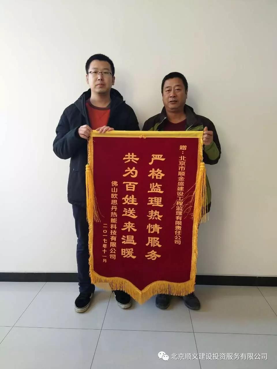 順義區(qū)2017年農(nóng)村地區(qū)“煤改電”工程實施以來,北京市順金盛建設工程監(jiān)理有限責任公司已收到3面錦旗,分別來自順義區(qū)牛欄山鎮(zhèn)政府、佛山歐思丹熱能科技有限公司和南彩鎮(zhèn)前郝家疃村村民李躍來。