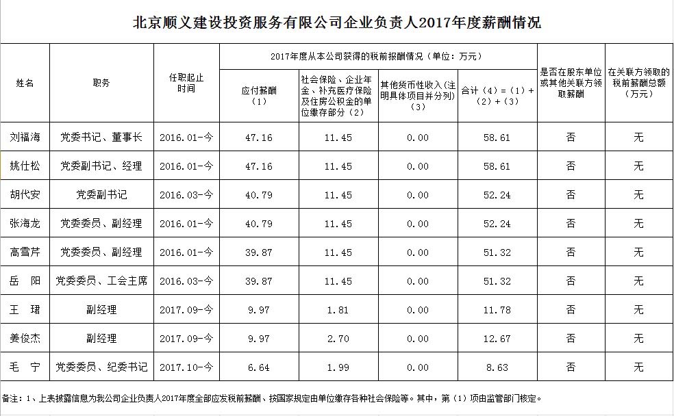 北京順義建設(shè)投資服務(wù)有限公司企業(yè)負(fù)責(zé)人2017年度薪酬信息披露