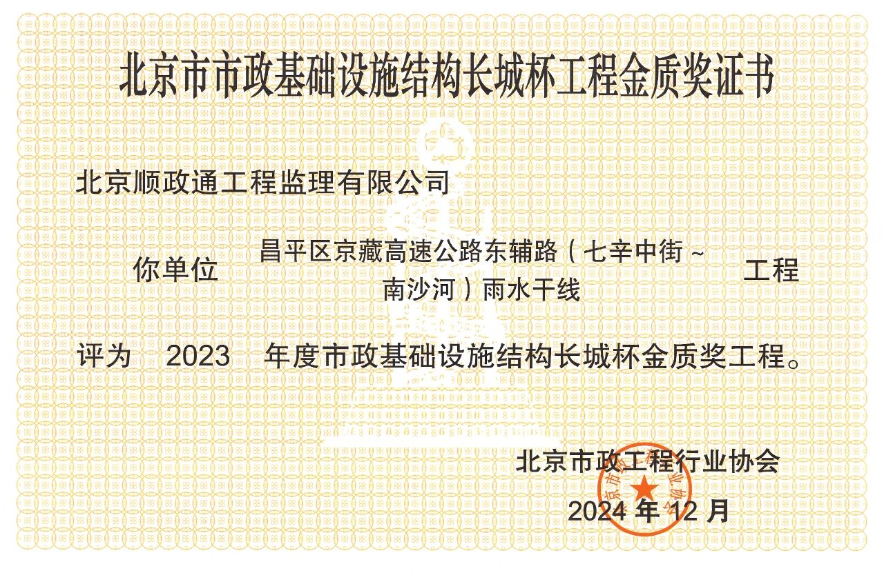 順政通監(jiān)理公司喜獲北京市市政基礎設施工程結構長城杯金質獎