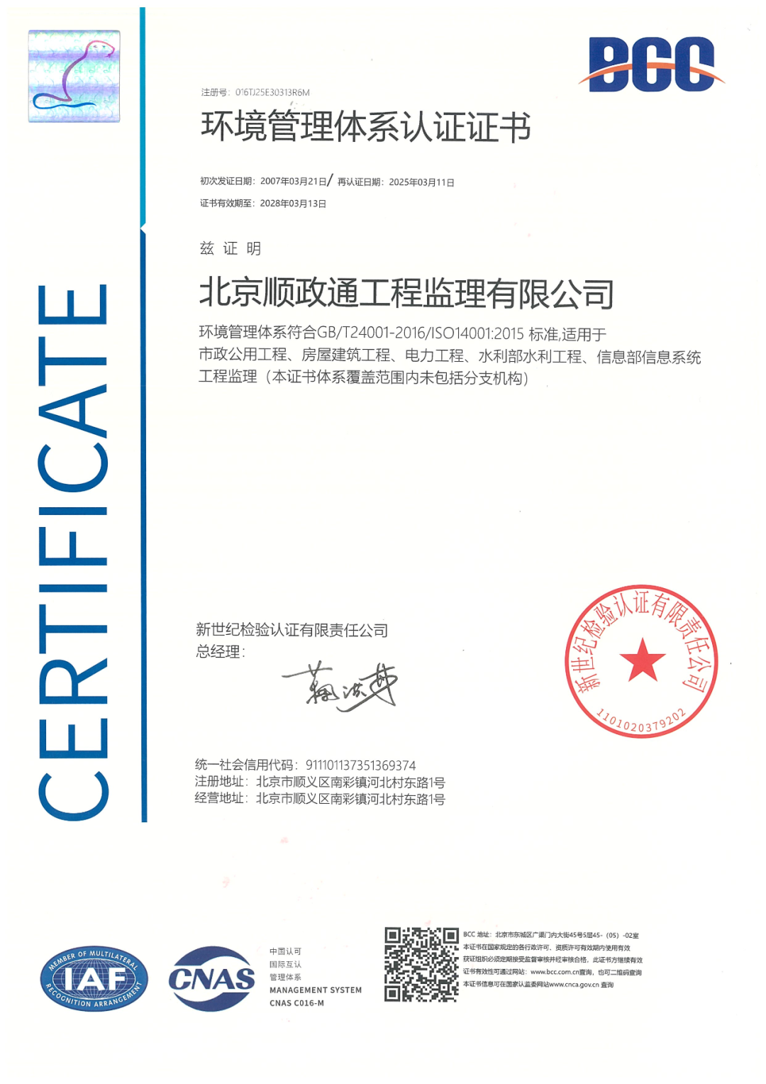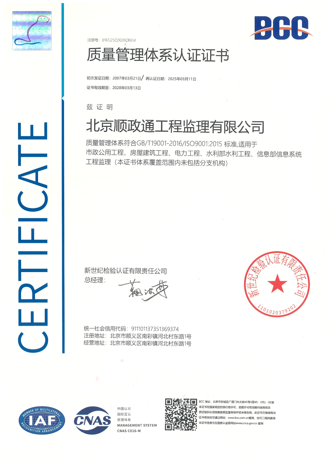三月初,北京順義建設(shè)投資服務(wù)有限公司(簡稱:順義建投)下屬順政通公司順利通過新世紀檢驗認證公司專家審核組綜合管理體系再認證審核,取得新版認證證書。