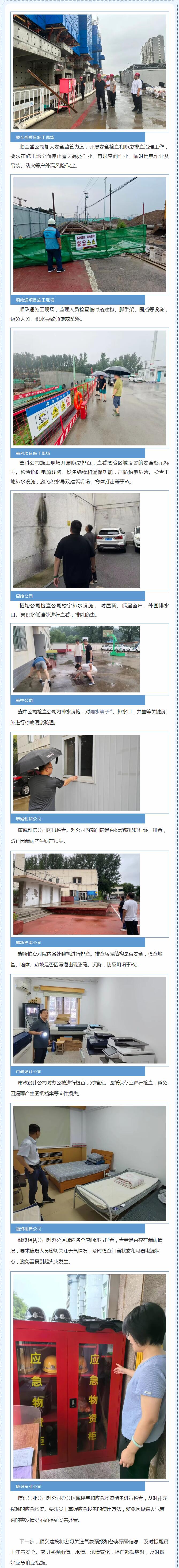 7月28日13時00分,順義區(qū)氣象臺升級發(fā)布暴雨紅色預(yù)警。順義建投立刻采取防汛應(yīng)急程序,按照《防汛工作方案》《防汛指揮調(diào)度工作方案》工作要求部署開展防汛工作。公司上下聞“汛”而動,全面排查整治安全隱患。