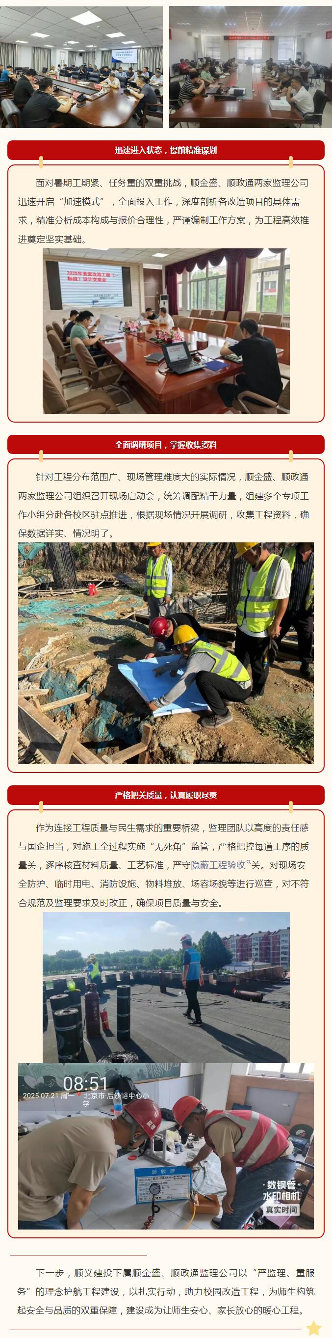 順義建投下屬子企業(yè)順金盛監(jiān)理公司、順政通監(jiān)理公司承接區(qū)內(nèi)部分學(xué)校食堂、校內(nèi)設(shè)施、專業(yè)教室改造,以及供暖系統(tǒng)升級和配套接收學(xué)校改造等多項監(jiān)理項目。面對時間緊、任務(wù)重和標準高等要求,兩家監(jiān)理公司高度重視,周密部署,多措并舉,確保項目按時保質(zhì)完成